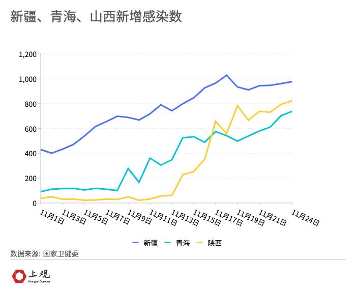 11月18日,新疆单日新增超1000例,19日较前一天下降94例,20日开始,单日新增感染数再次上升。
