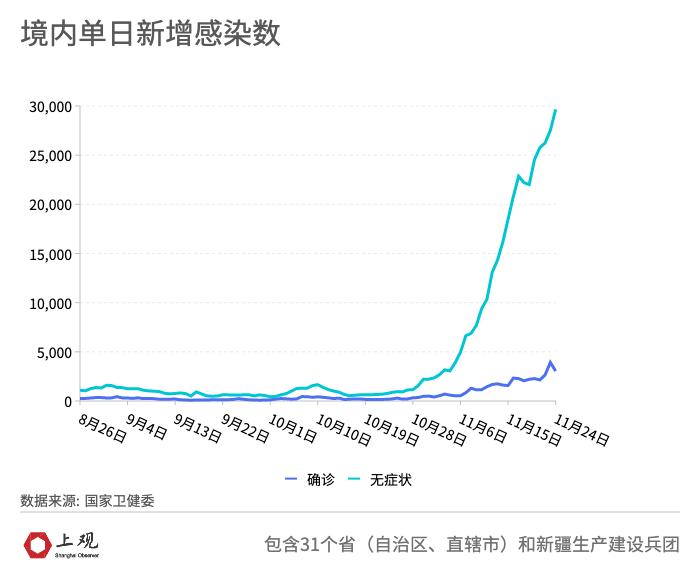11月23日,境内本土单日新增感染数(包括确诊病例和无症状感染者,下同)超30000例。