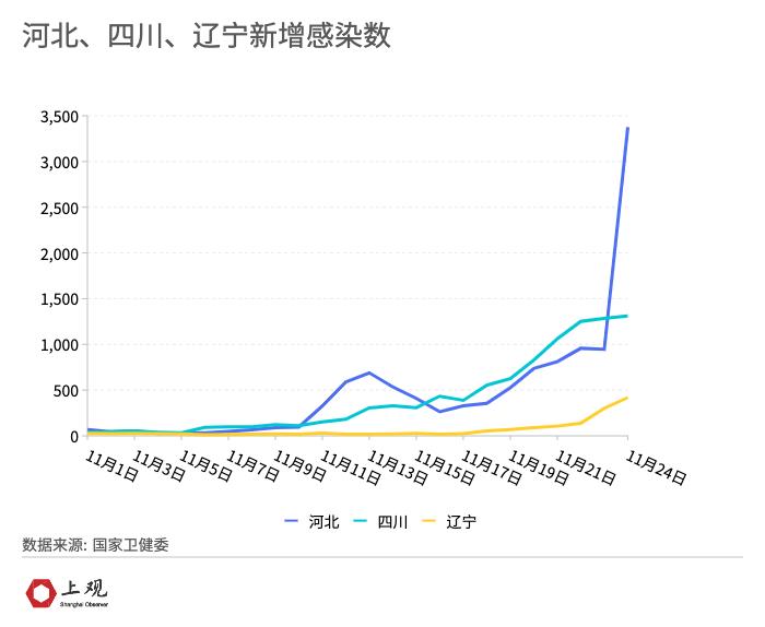 11月24日,河北省单日新增感染数3375例,较前日增加2426例,呈现激增状态。
