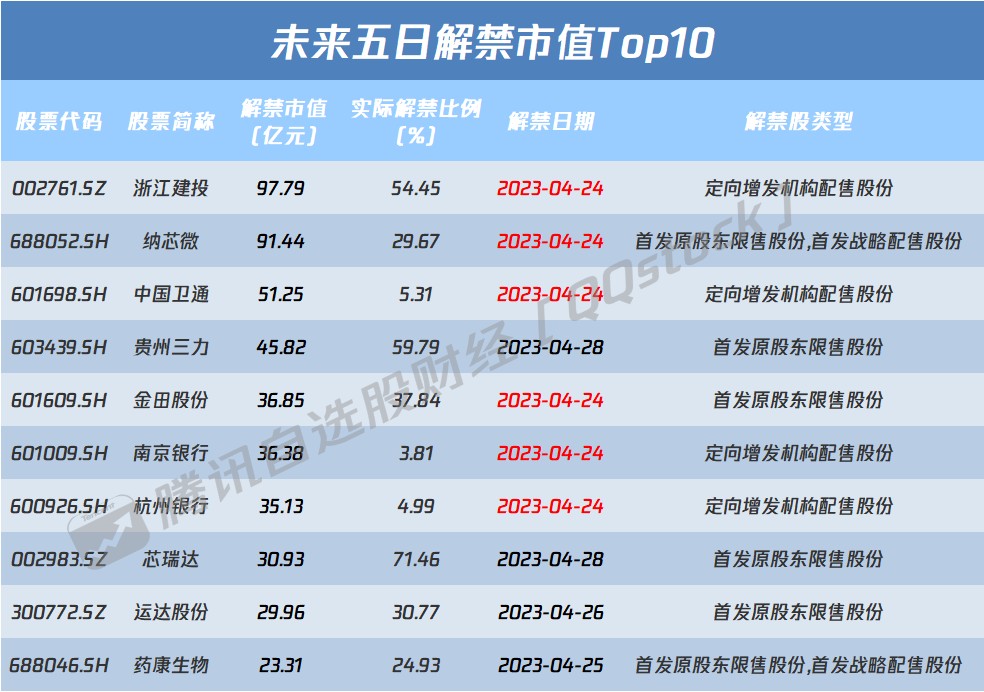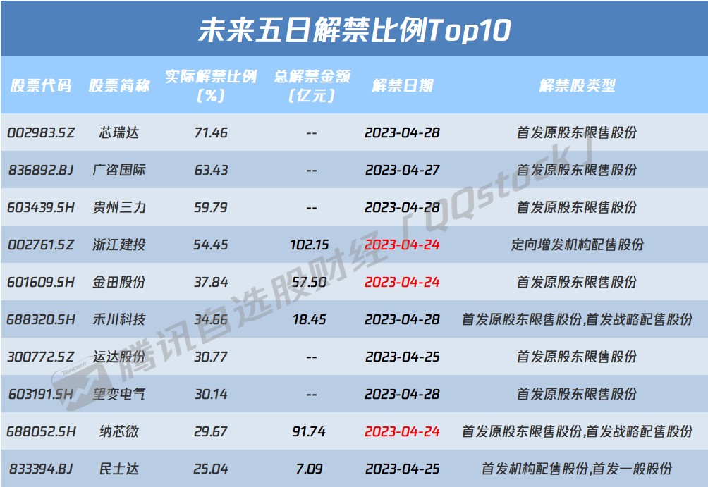 从解禁比例来看,未来五日芯瑞达解禁比例达71.46%,其次解禁比例居前的分别为广咨国际和贵州三力;从解禁市值来看,浙江建投、纳芯微、中国卫通等股解禁市值居前。