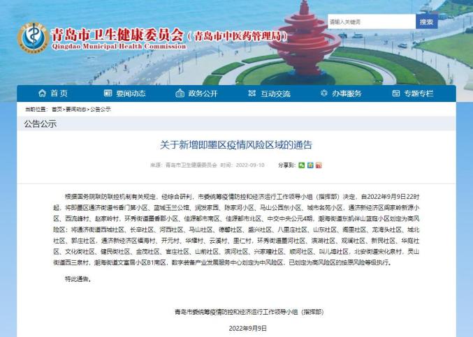 根据国务院联防联控机制有关规定,经综合研判,青岛市委统筹疫情防控和经济运行工作领导小组(指挥部)决定,自2022年9月9日22时起,将即墨区通济街道书香门第小区、蓝城玉兰公馆、润发家园、陈家河小区、马山公园东小区、城市名苑小区,通济新经济区阎家岭新源小区、西流峰村、赵家岭村,环秀街道墨香郡小区、佳源都市南区、佳源都市北区、中交中央公元4期,潮海街道东凯伴山蓝庭小区划定为高风险区;将通济街道西城社区、长辛社区、河西社区、马山社区、德馨社区、盛兴社区、八里庄社区、山东社区、阁里社区、龙湾头社区、城北社区、郭庄社区,通济新经济区福海村、开元村、华耀村、云溪村、里仁村,环秀街道墨河社区、滨湖社区、观澜社区、新民社区、华庭社区、文化街社区、健民街社区、金茂社区、官庄社区、山前社区、滨河社区、兴家疃社区、顺河社区、叫儿埠社区,北安街道宋化泉村,灵山街道西三泉村,潮海街道文富居小区B1南区,数字装备产业发展服务中心划定为中风险区,已划定为高风险区的按原风险等级执行。