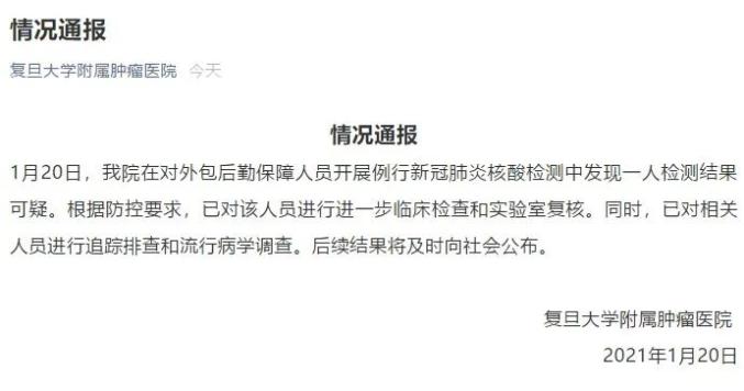 1月20日,我院在对外包后勤保障人员开展例行新冠肺炎核酸检测中发现一人检测结果可疑。根据防控要求,已对该人员进行进一步临床检查和实验室复核。同时,已对相关人员进行追踪排查和流行病学调查。后续结果将及时向社会公布。