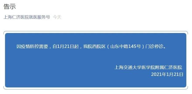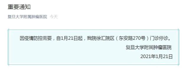 上海仁济医院就医服务号今日凌晨3点30分发推文称,因疫情防控需要,自1月21日起,上海交通大学医学院附属仁济医院西院区(山东中路145号)门诊停诊。复旦大学附属肿瘤医院官微也在早间6:53发出通知,称因疫情防控需要,自1月21日起,该院徐汇院区(东安路270号)门诊停诊。