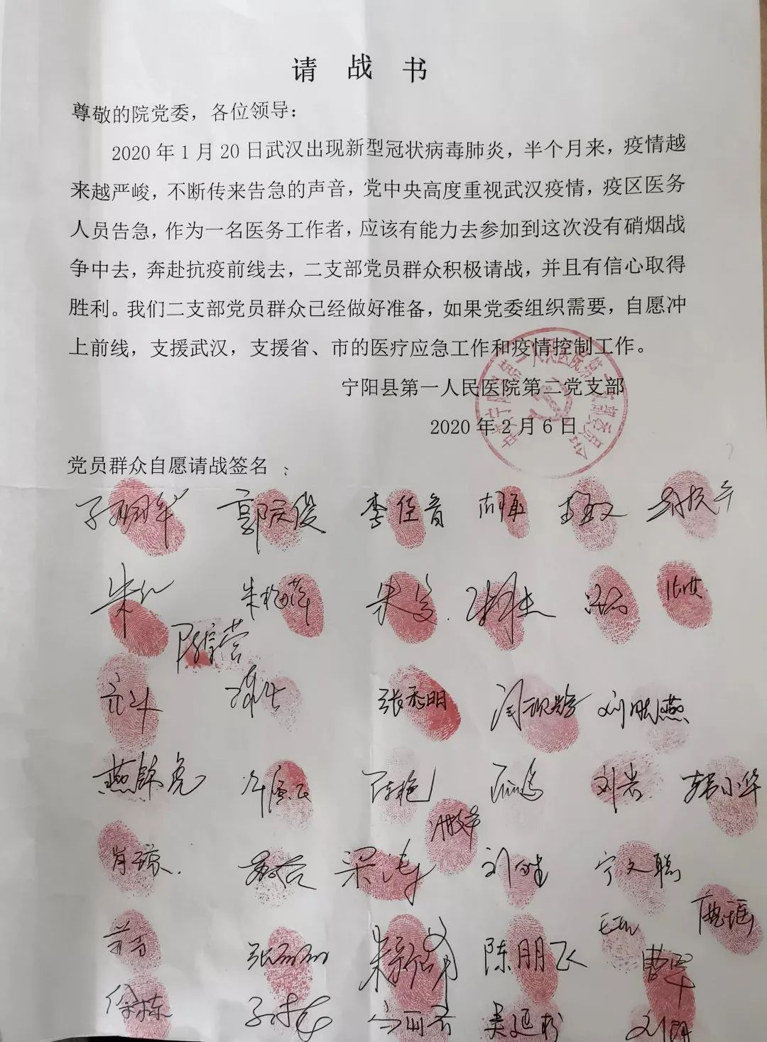 突如其来的新型冠状病毒感染的肺炎,牵动着亿万人民的心,宁阳县第一人民医院的党员干部职工迎难而上,带头请战,写下请愿书,朝着疫情逆行而上,志愿投身抗击疫情的攻坚战,筑起狙击病魔的铜墙铁壁。