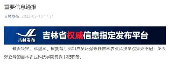 省委决定,总督学、省教育厅党组成员岳强兼任吉林农业科技学院党委书记;免去张立峰的吉林农业科技学院党委书记职务。
