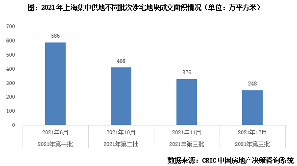 首先,供应总量层面,2021年恰逢集中供地,叠加“十四五”元年,上海政府供地力度明显加大,土拍市场持续放量,全年涉宅用地成交量突破1500万平方米。从供地节奏来看,共计三批次供地,第一批次6月和第三批次11-12月涉宅用地成交量分别达到586万平方米和574万平方米,迎来两拨土拍成交高峰。