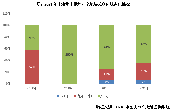 从2021年整体涉宅用地成交环线分布来推断2022年新增供应区域结构,可以看出,涉宅用地外环以内成交占比已攀升至36%;其中内环至外环的占比由2020年的19%上升了10个百分点至2021年的29%,市中心内环内涉宅用地保持稀缺,2021年占比仅为7%,而外郊环、郊环外为主供场,成交活跃板块多为五大新城、大虹桥区域。