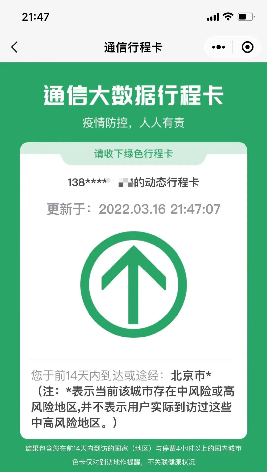 当晚,记者查询“通信行程卡”,发现14天内到达或途径北京市的行程已经带了 *(星号)。