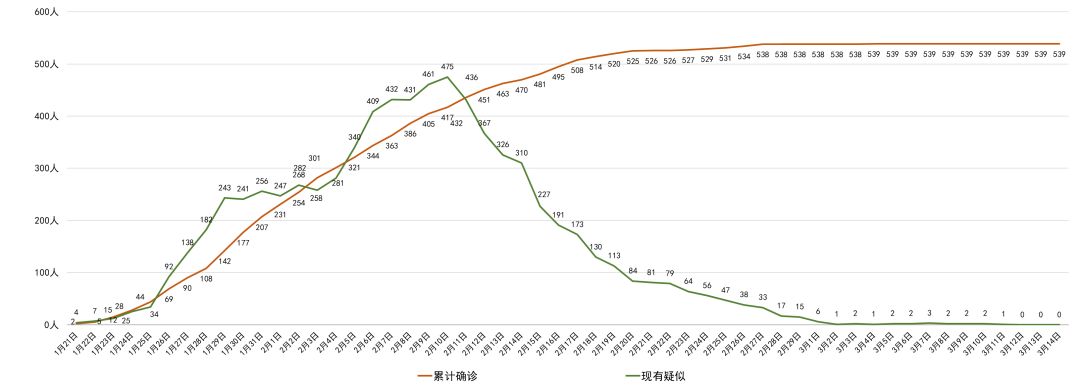 截至3月14日0时,我省累计报告新型冠状病毒肺炎确诊病例539例,涉及21个市(州)。