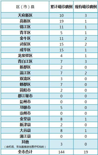 常住成都病例按照现住址、外地来蓉病例按照暂住地址划分,累计确诊病例及现有确诊病例(扣减出院及死亡病例)分布如下: