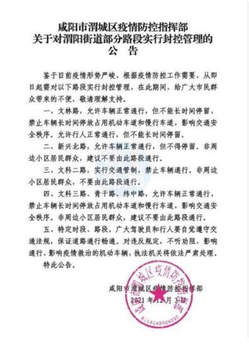 12月3日,咸阳市渭城区疫情防控指挥部发布消息,鉴于目前防控形势严峻,根据疫情防控工作需要,从即日起需对渭城区渭阳街道部分路段实行封控管理。