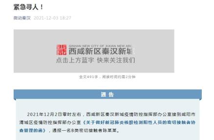 12月3日,“微动秦汉”微信公众号发布消息称,12月2日零时左右,西咸新区秦汉新城疫情防控指挥部办公室接到咸阳市渭城区疫情防控指挥部办公室《关于做好新冠肺炎核酸检测阳性人员的密切接触者协查管理的函》,通报一名B类密切接触者陈某某。