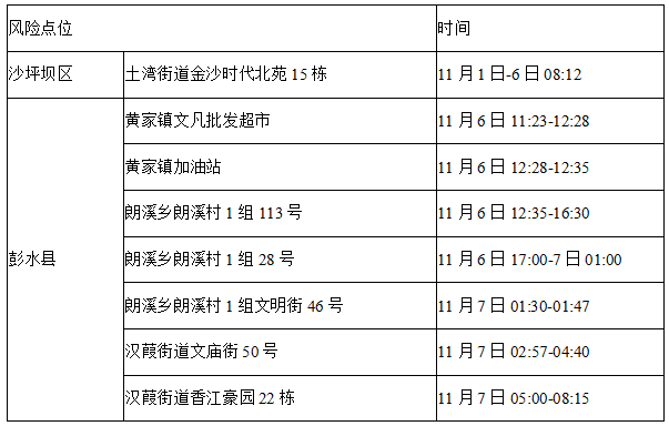 2022年11月8日,彭水自治县报告无症状感染者3。现将在渝主要活动轨迹的风险点位和时间通告如下: