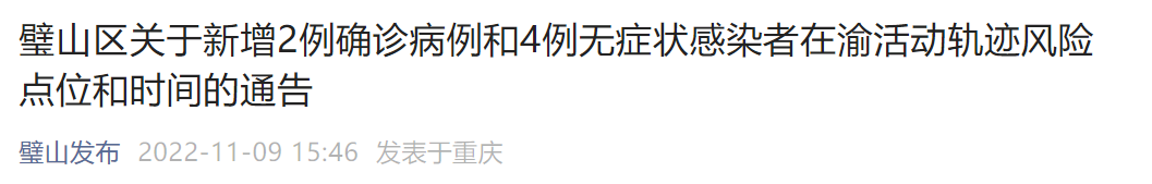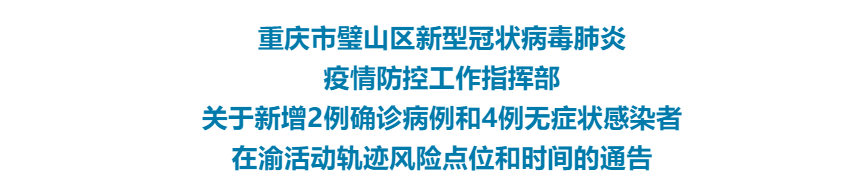 11月9日,重庆市璧山区新型冠状病毒肺炎疫情防控工作指挥部发布关于新增2例确诊病例和4例无症状感染者在渝活动轨迹风险点位和时间的通告。