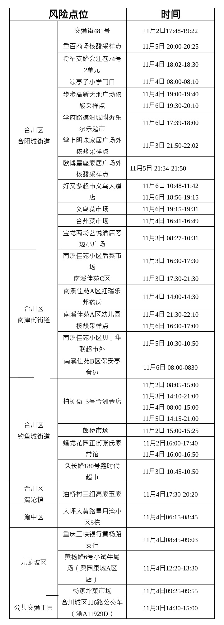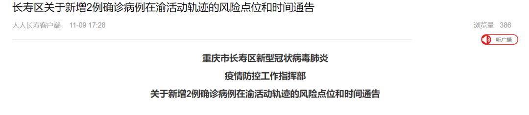 11月9日,重庆市长寿区新型冠状病毒肺炎疫情防控工作指挥部发布关于新增2例确诊病例在渝活动轨迹的风险点位和时间通告。