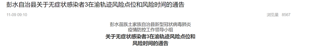 11月9日,彭水苗族土家族自治县新型冠状病毒肺炎疫情防控工作领导小组发布关于无症状感染者3在渝轨迹风险点位和风险时间的通告。