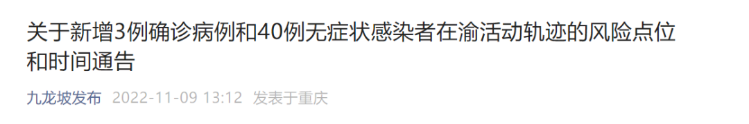11月8日,重庆市九龙坡区新型冠状病毒肺炎疫情防控指挥部发布关于新增3例确诊病例和40例无症状感染者在渝活动轨迹的风险点位和时间通告。