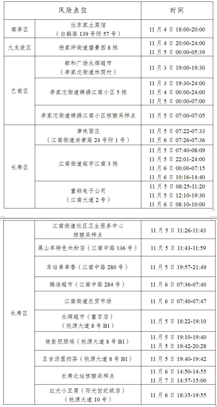 2022年11月8日,长寿区新增报告2例确诊病例(确诊病例5-6)。现将在渝主要活动轨迹的风险点位和时间通告如下: