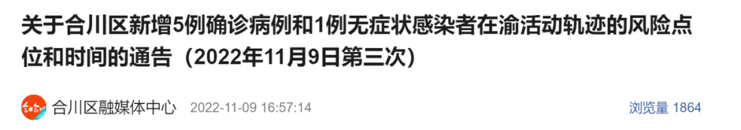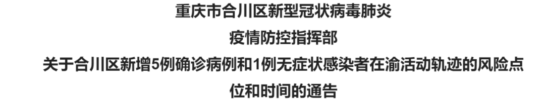 11月9日,重庆市合川区新型冠状病毒肺炎疫情防控指挥部发布关于合川区新增5例确诊病例和1例无症状感染者在渝活动轨迹的风险点位和时间的通告。