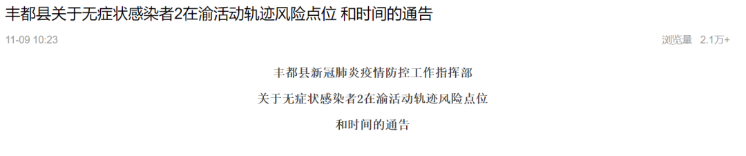 11月9日,丰都县新冠肺炎疫情防控工作指挥部关于无症状感染者2在渝活动轨迹风险点位和时间的通告。