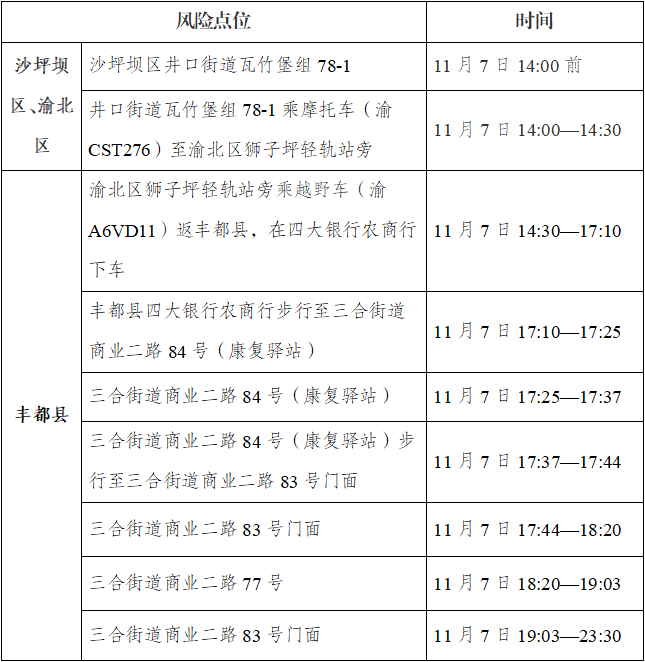 2022年11月8日,丰都县新增报告1例无症状感染者(无症状感染者2)。现将在渝主要活动轨迹的风险点位和时间通告如下: