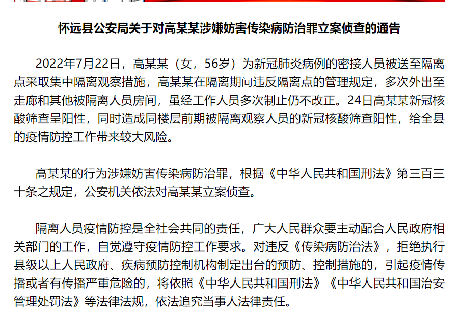 10月27日,据怀远发布,安徽怀远县公安局关于对高某某涉嫌妨害传染病防治罪立案侦查的通告。