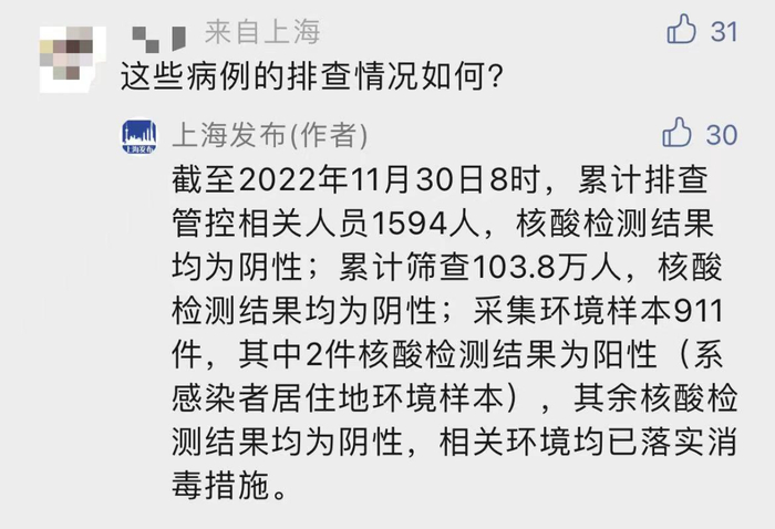 上海发布:截至2022年11月30日8时,累计排查管控相关人员1594人,核酸检测结果均为阴性;累计筛查103.8万人,核酸检测结果均为阴性;采集环境样本911件,其中2件核酸检测结果为阳性(系感染者居住地环境样本),其余核酸检测结果均为阴性,相关环境均已落实消毒措施。