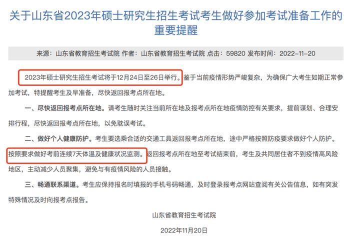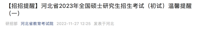 11月27日,河北省教育考试院发布研考提醒,2023年全国硕士研究生招生考试将于12月24—26日进行。请考生注意以下事项:合理安排赴考行程;做好个人健康防护;畅通联系沟通渠道。