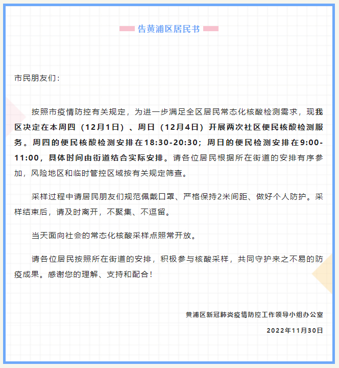 为进一步满足全区居民常态化核酸检测需求,即日起,本区将每周组织开展两次(周四和周日)社区便民核酸检测服务。本周四(12月1日)和周日(12月4日)居民朋友们可根据所在街镇安排,有序参加便民核酸检测。采样期间请规范佩戴口罩、保持2米以上安全距离、避免人员聚集,做好个人防护。