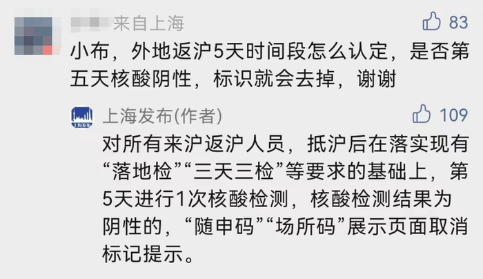 上海发布:对所有来沪返沪人员,抵沪后在落实现有“落地检”“三天三检”等要求的基础上,第5天进行1次核酸检测,核酸检测结果为阴性的,“随申码”“场所码”展示页面取消标记提示。