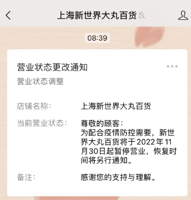 今天,上海新世界大丸百货在其公众号上发布“营业状态更改通知”:为配合疫情防控需要,新世界大丸百货将于2022年11月30日起暂停营业,恢复时间将另行通知。