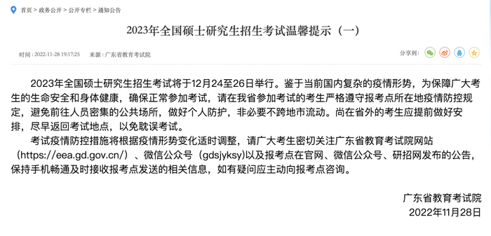 11月28日晚,广东省教育考试院发布研考温馨提示。其中称,2023年全国硕士研究生招生考试将于12月24至26日举行。请考生避免前往人员密集的公共场所,做好个人防护,非必要不跨地市流动。尚在省外的考生应提前做好安排,尽早返回考试地点,以免耽误考试↓。
