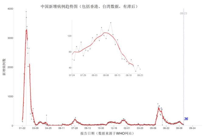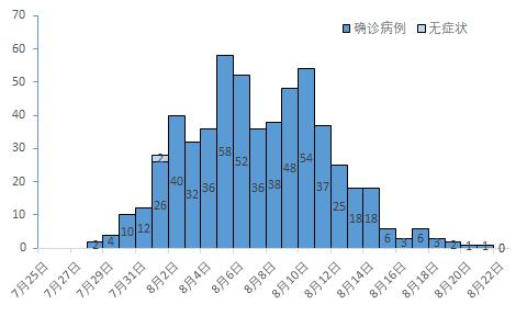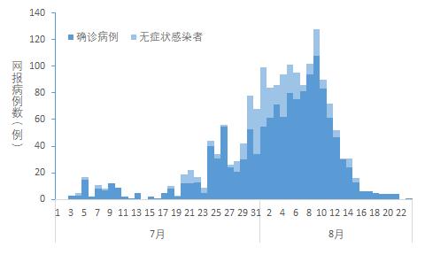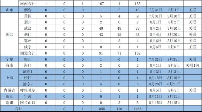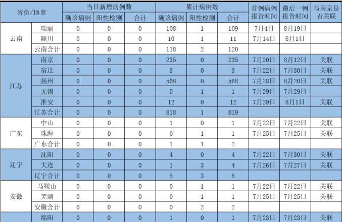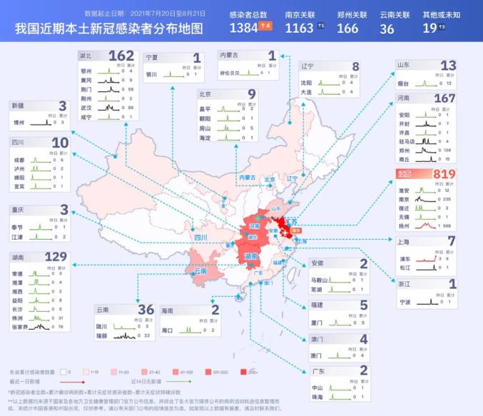 截止8月23日24时,全国累计报告确诊病例1355例,无症状感染者110例,合计感染者1465例。共涉及 19省 47地市,病例数居前3位的地市为扬州、南京、郑州。