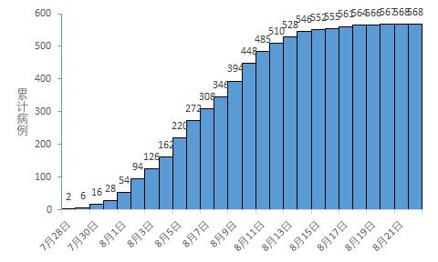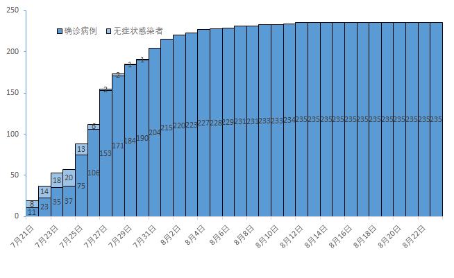 截止8月23日24时,南京本地报告共报告235确诊病例,无症状感染者0例。