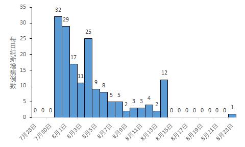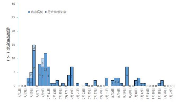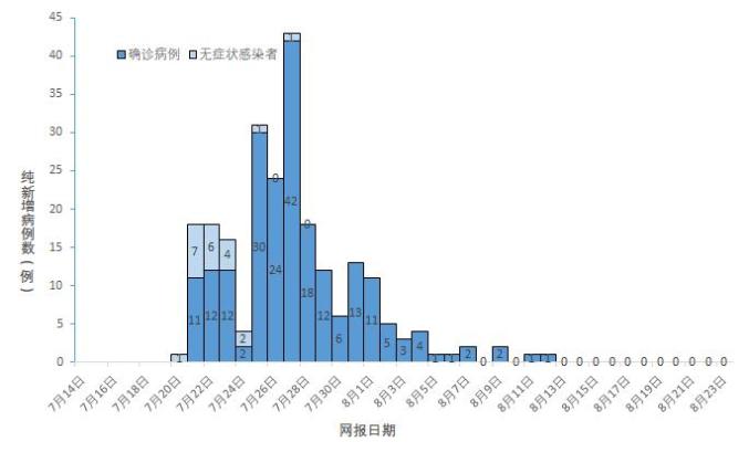 南京自7月20日报告本地病例以来,按照网报日期,每日纯新增情况如下图所示。