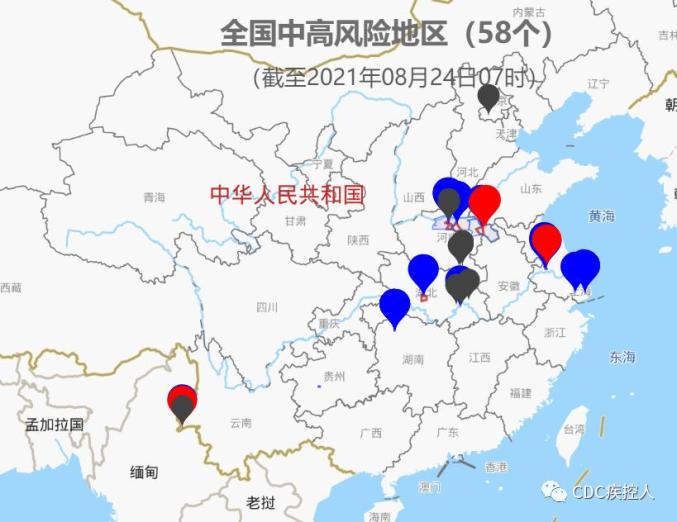 截止2021年8月24日6时:全国共有高风险地区4个,在云南省德宏州瑞丽市1个、江苏省扬州市1个、河南省商丘市2个。中风险地区54个,其中云南省德宏州1个;江苏省扬州市23个;湖南省张家界市6个;河南省郑州市7个,商丘市2个,开封7个;湖北省武汉市1个,荆门市2个;上海市5个。具体如下: