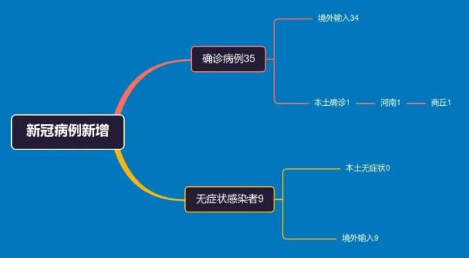 8月23日0—24时,31个省(自治区、直辖市)和新疆生产建设兵团报告新增确诊病例35例,其中境外输入病例34例(上海9例,广东8例,浙江7例,云南4例,福建2例,四川2例,天津1例,陕西1例),本土病例1例(在河南);无新增死亡病例;新增疑似病例1例,为境外输入病例(在上海)。
