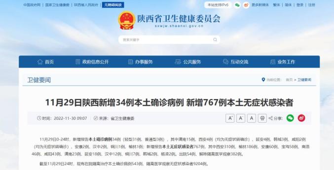 11月29日0-24时,新增报告本土确诊病例34例(轻型31例、普通型3例),其中渭南15例、西安4例(均为无症状转确诊)、延安4例、韩城3例、咸阳2例(均为无症状转确诊)、安康2例、汉中2例、铜川1例、榆林1例;新增报告本土无症状感染者767例,其中西安310例、榆林186例、安康60例、宝鸡58例、商洛46例、咸阳43例、渭南23例、延安18例、汉中12例、铜川7例、韩城2例、杨凌2例。出院54例、解除隔离医学观察382例。