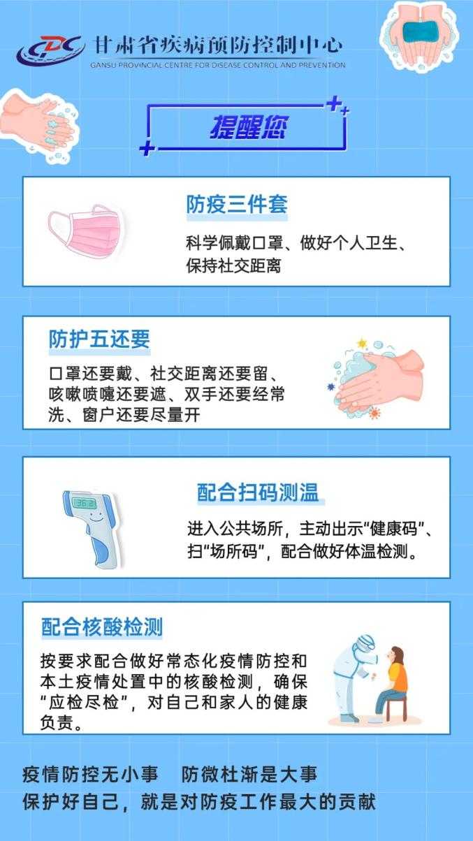 兰州市城关区新型冠状病毒肺炎疫情联防联控领导小组办公室发布公告,9月13日,兰州市城关区在疫情防控工作过程中,经风险研判,现提醒广大群众落实好以下防控措施: