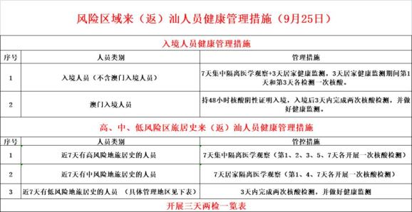 近7天内有低风险区旅居史来(返)汕人员实施3天内完成两次核酸检测,并做好健康监测。