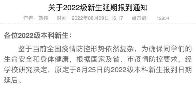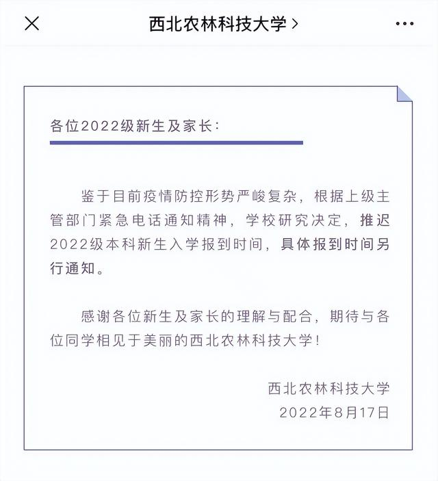 8月17日,西北农林科技大学发布通知:鉴于目前疫情防控形势严峻复杂,根据上级主管部门紧急电话通知精神,学校研究决定,推迟2022级本科新生入学报到时间,具体报到时间另行通知。