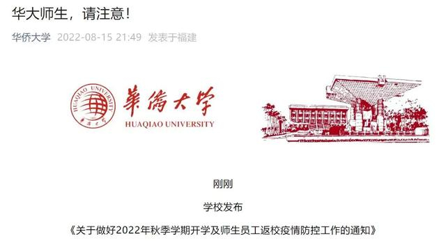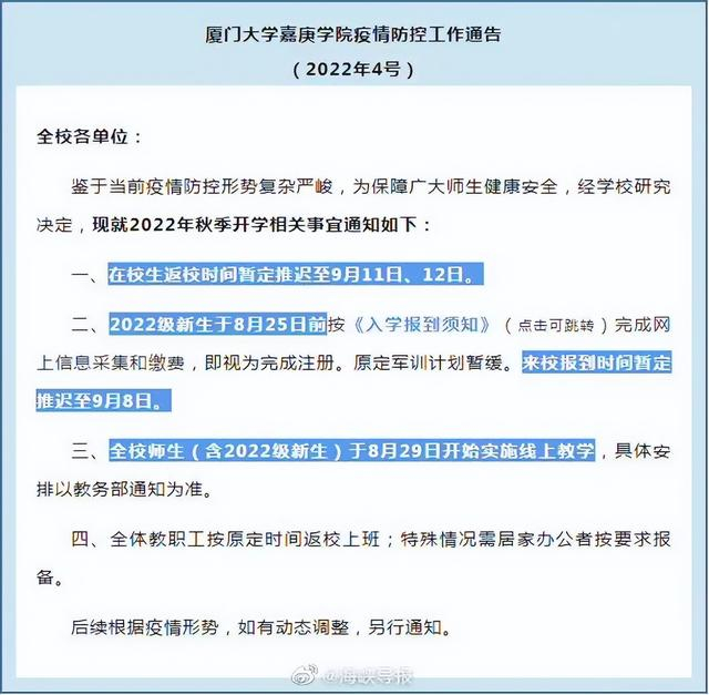 在校生返校时间暂定推迟至9月11日、12日;2022级新生原定军训计划暂缓,来校报到时间暂定推迟至9月8日;全校师生(含2022级新生)于8月29日开始实施线上教学;全体教职工按原定时间返校上班。