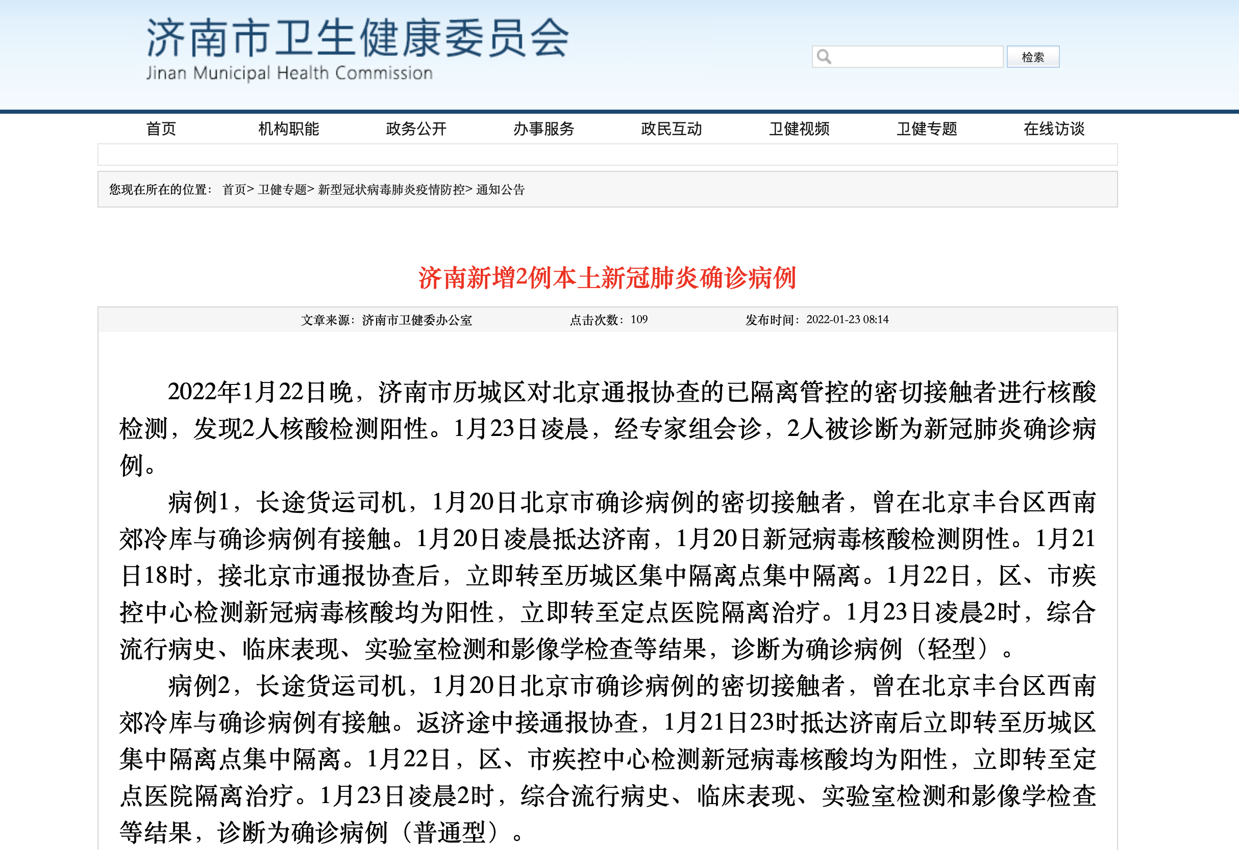 据济南市卫健委官网消息,2022年1月22日晚,济南市历城区报告2名已隔离管控人员新冠病毒核酸检测阳性。1月23日凌晨,经专家组会诊,2人被诊断为新冠肺炎确诊病例。