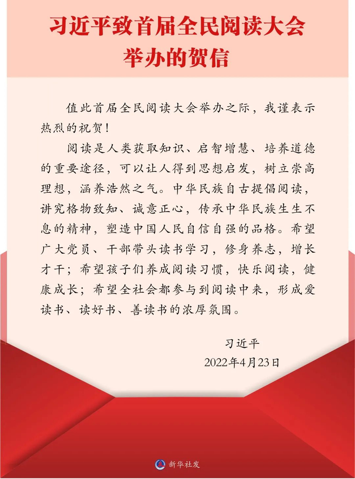 首届全民阅读大会4月23日在京开幕。中共中央总书记、国家主席、中央军委主席习近平发来贺信,表示热烈的祝贺。