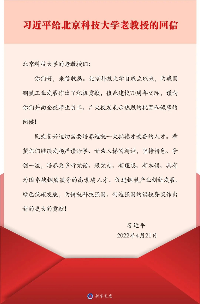 中共中央总书记、国家主席、中央军委主席习近平4月21日给北京科技大学的老教授回信,对培养更多高素质人才,促进钢铁产业创新发展、绿色低碳发展提出殷切期望。