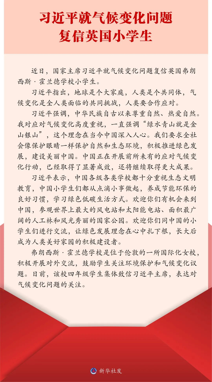 据新华社4月21日报道,近日,国家主席习近平就气候变化问题复信英国弗朗西斯·霍兰德学校小学生。