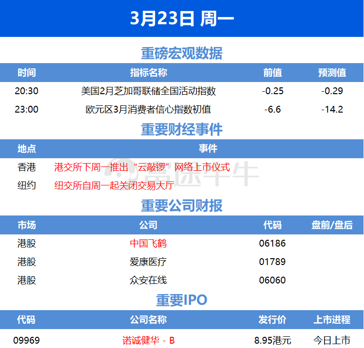 关键词:中国飞鹤/众安在线财报、诺诚健华上市、港交所「云敲锣」