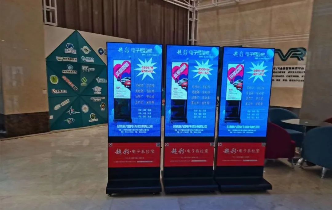 电子易拉宝是在LED橱窗屏的专利基础上,将专利产品进行优化,极大的压缩成本,通过将高清显示模组一体化,结合人机互动、手机控制等最新技术,将高端的显示屏做成系统操作便捷、机身轻薄、方便携带的一体化的显示终端。高端设备平民化之后,小超市、服装店、餐馆都可以使用电子易拉宝屏做广告宣传,电子易拉宝屏的推广,使人们的生活更加便捷。